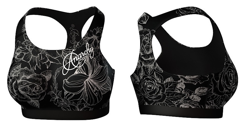 Das Muster des Vaeneti Sports Bras besteht aus schönen großen Blumen und Blumenranken. Der Aufdruck wurde in einem schlichten Weiß und Grau-/Grünton gehalten. Auf der linken Brust befindet sich noch der Logo Print „Anarchy“ in schöner Schreibschrift. Die Rückseite des Bras wurde natürlich auch mitbedruckt.
