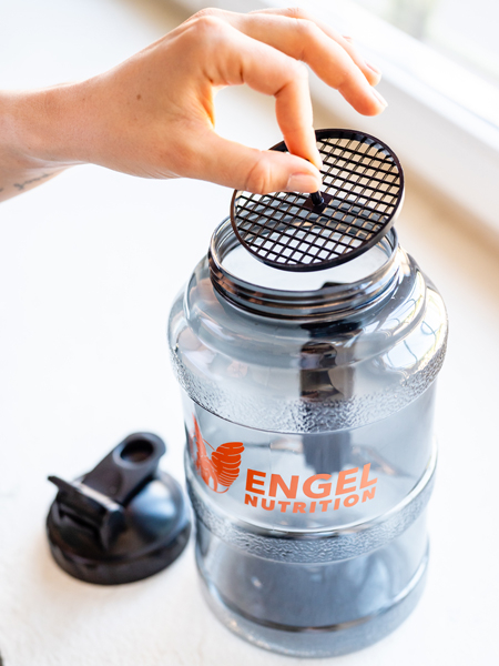 Die Besonderheit: Unsere Engel Nutrition Fitness Gallone verfügt anders als herkömmliche Trink- und Wasserflaschen über ein zusätzlich integriertes Schlagsieb. So bleibt durch kurzes schütteln jeder Drink klumpenfrei und schmackhaft wie frisch gemischt - egal wie lange du damit unterwegs bist. Die Trinklasche eignet sich somit auch als Shaker für Protein- oder Weight Gainer Drinks.