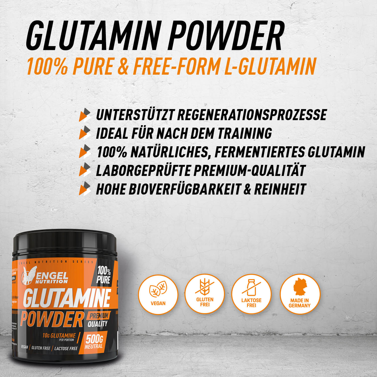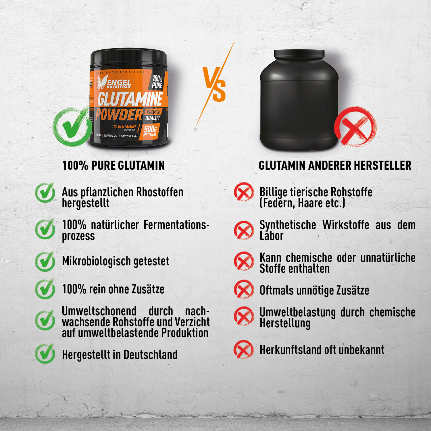 Während noch immer viele Glutamin Produkte aus billigen Rohstoffen wie Entenfedern, Haaren oder synthetisch hergestellt werden, setzen wir bei Sportnahrung Engel ausschließlich auf hochwertiges, 100% pflanzliches L-Glutamin mit bester Bioverfügbarkeit und maximalen Nutzen. Aus diesem Grund wird unser 100% Pure Glutamine nach strengen Richtlinien und Vorschriften auf natürlichem Weg fermentiert, Labor getestet. Es ist absolut frei von Rückständen und künstlichen Zusätzen.